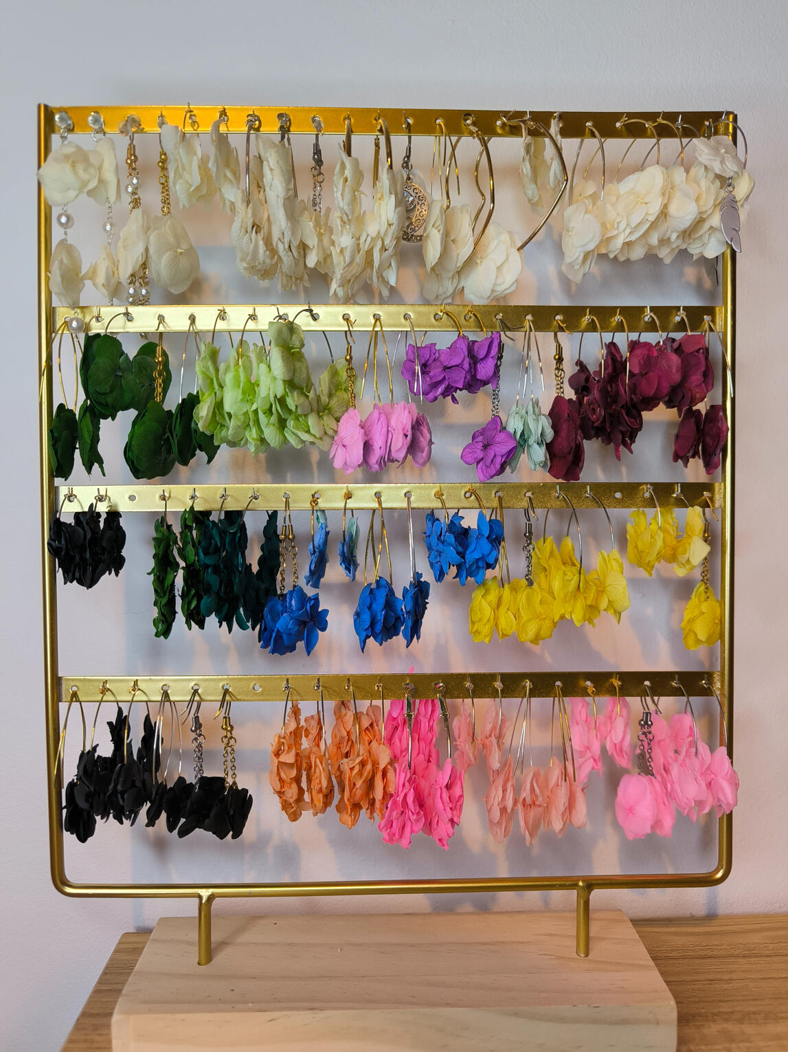 Sublimez votre visage avec nos boucles d'oreilles et colliers en fleurs éternelles. Véritables pièces artisanales, tous nos bijoux se déclinent dans les teintes de votre choix pour s'accorder parfaitement à votre bouquet ou à votre parure de tête.Chaque modèle est entièrement personnalisable : une harmonie unique créée à votre demande pour un cortège qui vous ressemble.